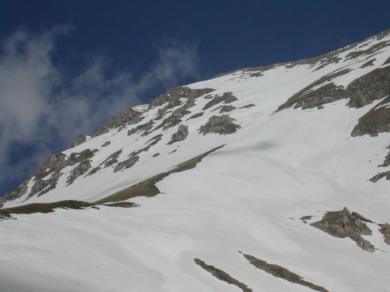 левее «красных скал» по широкому снежному кулуару. Крутизна